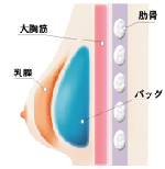 人工乳腺バッグを乳腺の下、大胸筋の上に挿入する方法です。乳腺を傷つけずに安全に挿入していきますので、出産後の授乳等にも影響はありません。感触がとてもやわらかく自然な仕上がりです。